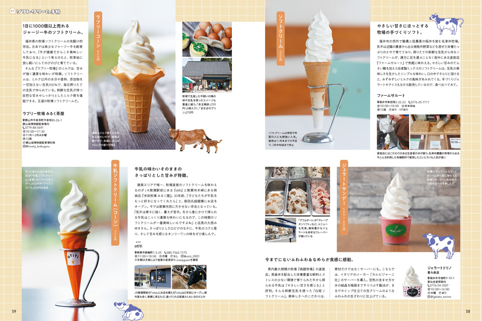 ソフトクリームは夏の食べ物だと思っている人、多いですよね? 実はソフトクリームはちょっと肌寒くなってくる秋からが美味しいのです。その理由は牛乳の旬がこれからだから。特集では老舗店から新店まで個性派ソフトを多数紹介。ミルクの旨味あふれるプレーンから味噌、日本酒、かぼちゃ、蜂蜜、トマトなど変わり種ソフトが勢ぞろいしています。福井の美味しいソフトクリーム、ぜひ召し上がれ!